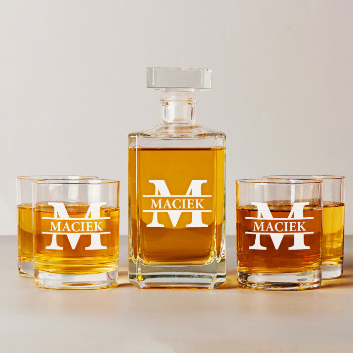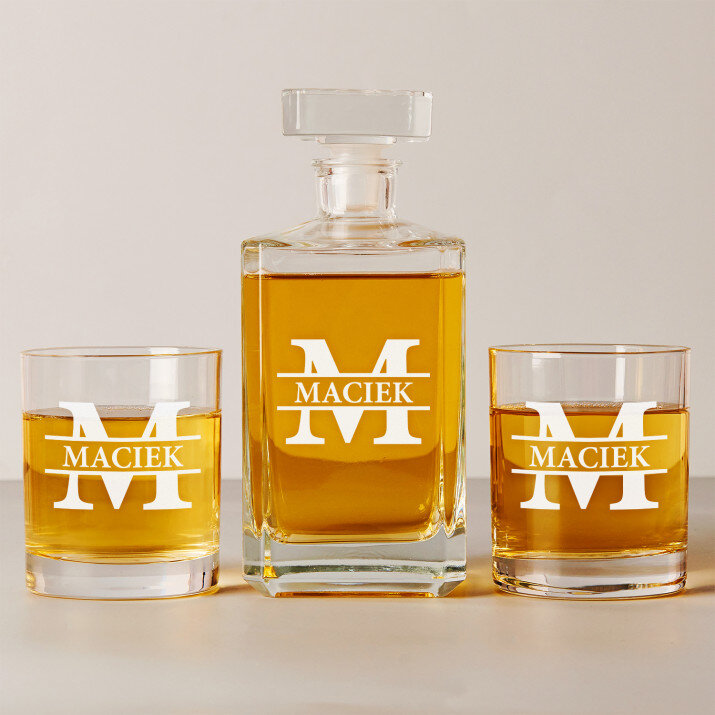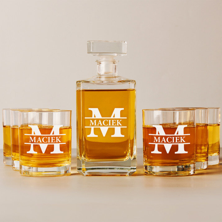Wysokiej jakości zestaw szklanek to whisky z karafką z przezroczystego szkła to prezent, który pasuje na wiele ważnych okazji. W takiej karafce można zaserwować whisky, nalewkę lub inny ulubiony trunek. Prosta forma i elegancki styl sprawiają, że produkt będzie pasował zarówno do weekendowych spotkań z najbliższymi, jak i do uroczystych przyjęć. Kwadratowy kształt karafki załamuje światło, które pięknie wydobywa barwę trunku. Na powierzchni karafki umieszczamy personalizowany grawer, który dodaje upominkowi wyjątkowego charakteru. Stylowe szklanki do whisky są wykonane z bezbarwnego szkła z charakterystycznymi wgłębieniami w dnie, które przypominają kryształki lodu. Minimalistyczny i elegancki design sprawia, że ulubiony trunek pięknie się prezentuje, a gładkie ścianki wspaniale eksponują grawer.