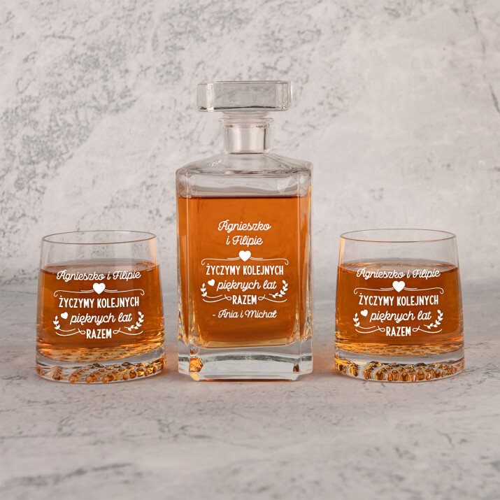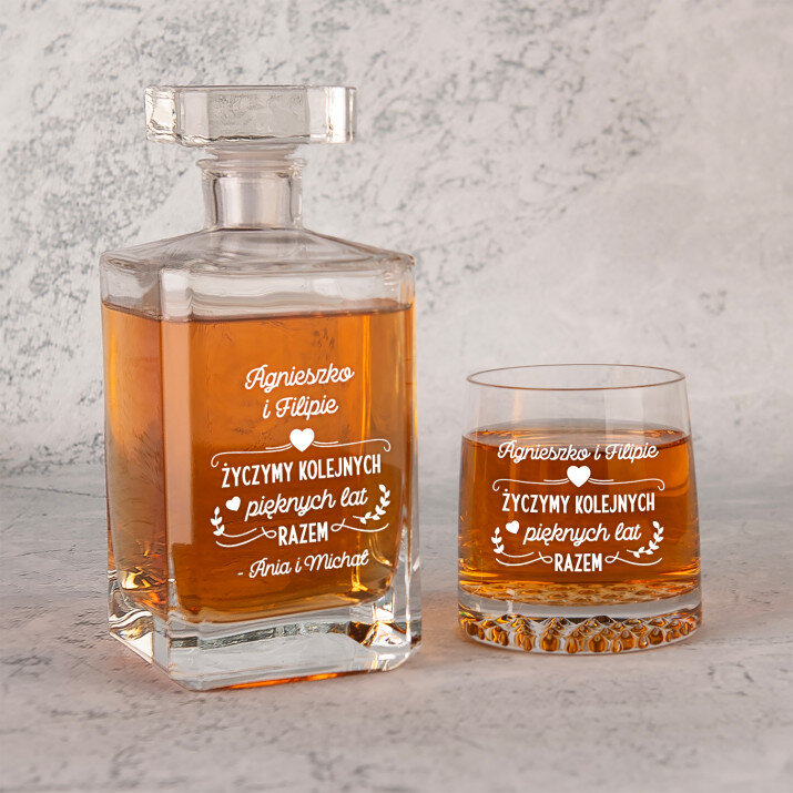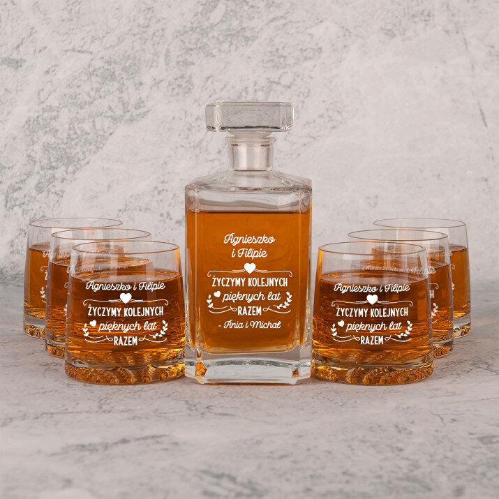 Wysokiej jakości zestaw szklanek to whisky z karafką z przezroczystego szkła to prezent, który pasuje na wiele ważnych okazji. W takiej karafce można zaserwować whisky, nalewkę lub inny ulubiony trunek. Prosta forma i elegancki styl sprawiają, że produkt będzie pasował zarówno do weekendowych spotkań z najbliższymi, jak i do uroczystych przyjęć. Kwadratowy kształt karafki załamuje światło, które pięknie wydobywa barwę trunku. Na powierzchni karafki umieszczamy personalizowany grawer, który dodaje upominkowi wyjątkowego charakteru. Stylowe szklanki do whisky są wykonane z bezbarwnego szkła z charakterystycznymi wgłębieniami w dnie, które przypominają kryształki lodu. Minimalistyczny i elegancki design sprawia, że ulubiony trunek pięknie się prezentuje, a gładkie ścianki wspaniale eksponują grawer.
