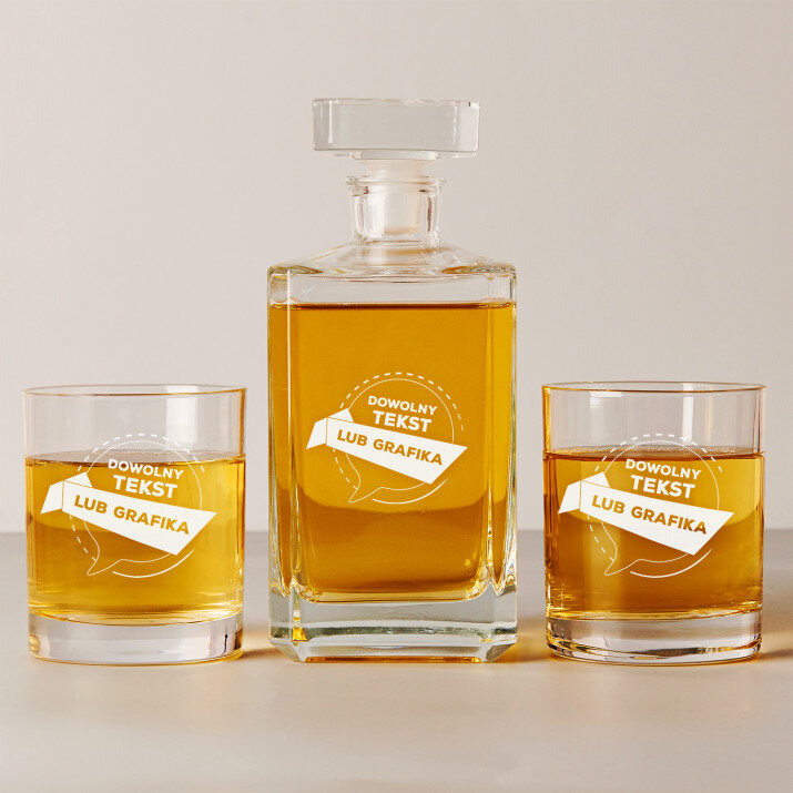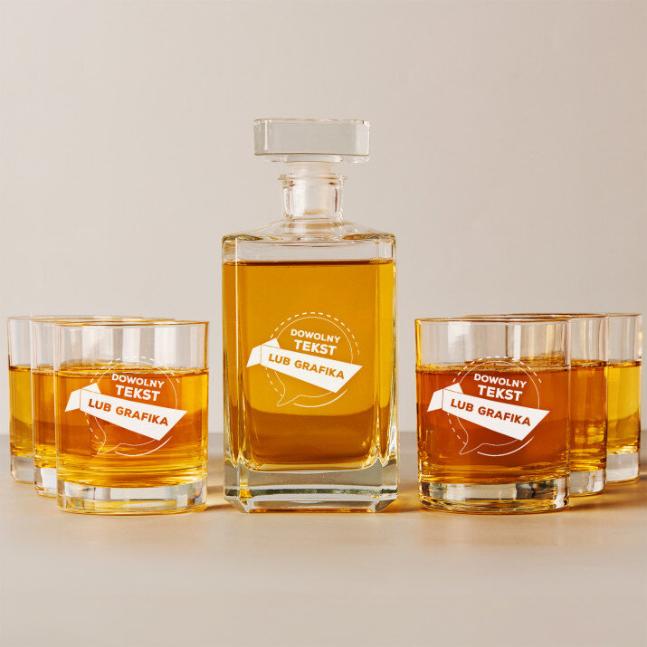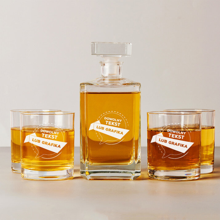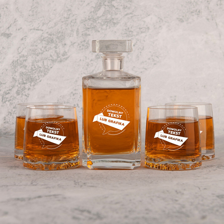 Wysokiej jakości zestaw szklanek to whisky z karafką z przezroczystego szkła to prezent, który pasuje na wiele ważnych okazji. W takiej karafce można zaserwować whisky, nalewkę lub inny ulubiony trunek. Prosta forma i elegancki styl sprawiają, że produkt będzie pasował zarówno do weekendowych spotkań z najbliższymi, jak i do uroczystych przyjęć. Kwadratowy kształt karafki załamuje światło, które pięknie wydobywa barwę trunku. Na powierzchni karafki umieszczamy personalizowany grawer, który dodaje upominkowi wyjątkowego charakteru. Stylowe szklanki do whisky są wykonane z bezbarwnego szkła z charakterystycznymi wgłębieniami w dnie, które przypominają kryształki lodu. Minimalistyczny i elegancki design sprawia, że ulubiony trunek pięknie się prezentuje, a gładkie ścianki wspaniale eksponują grawer.Pojemność karafki: 700 ml